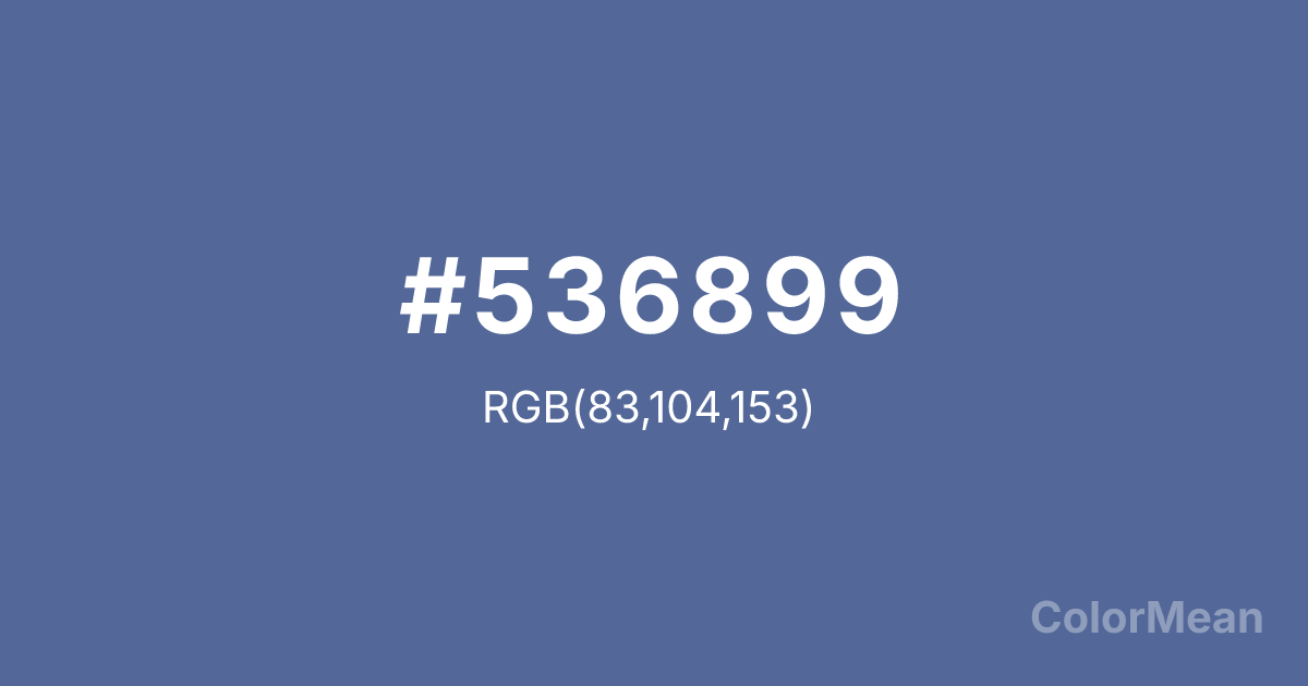 #536899 RGB value is (83, 104, 153). The hex color red value is 83, green is 104, and blue is 153. Its HSL format shows a hue of 222°, saturation of 30 percent, and lightness of 46 percent. The CMYK process values are 46 percent, 32 percent, 0 percent, 40 percent.