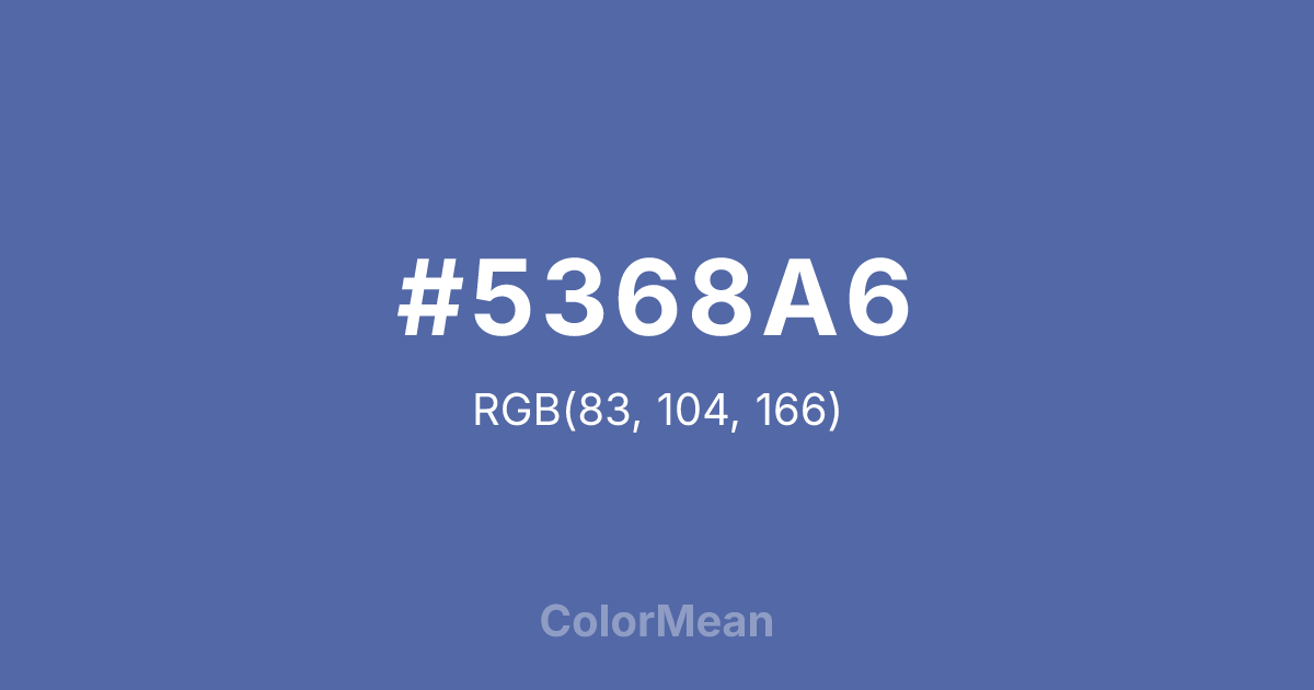 #5368A6 RGB value is (83, 104, 166). The hex color red value is 83, green is 104, and blue is 166. Its HSL format shows a hue of 225°, saturation of 33 percent, and lightness of 49 percent. The CMYK process values are 50 percent, 37 percent, 0 percent, 35 percent.