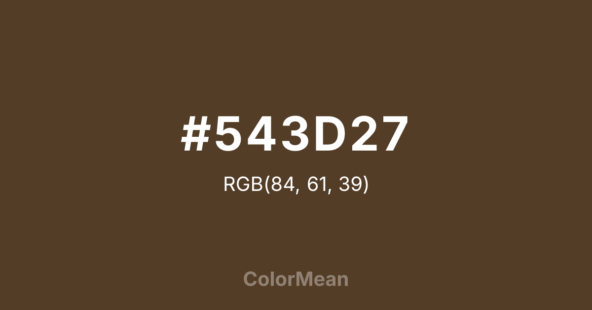 #543D27 RGB value is (84, 61, 39). The hex color red value is 84, green is 61, and blue is 39. Its HSL format shows a hue of 29°, saturation of 37 percent, and lightness of 24 percent. The CMYK process values are 0 percent, 27 percent, 54 percent, 67 percent.