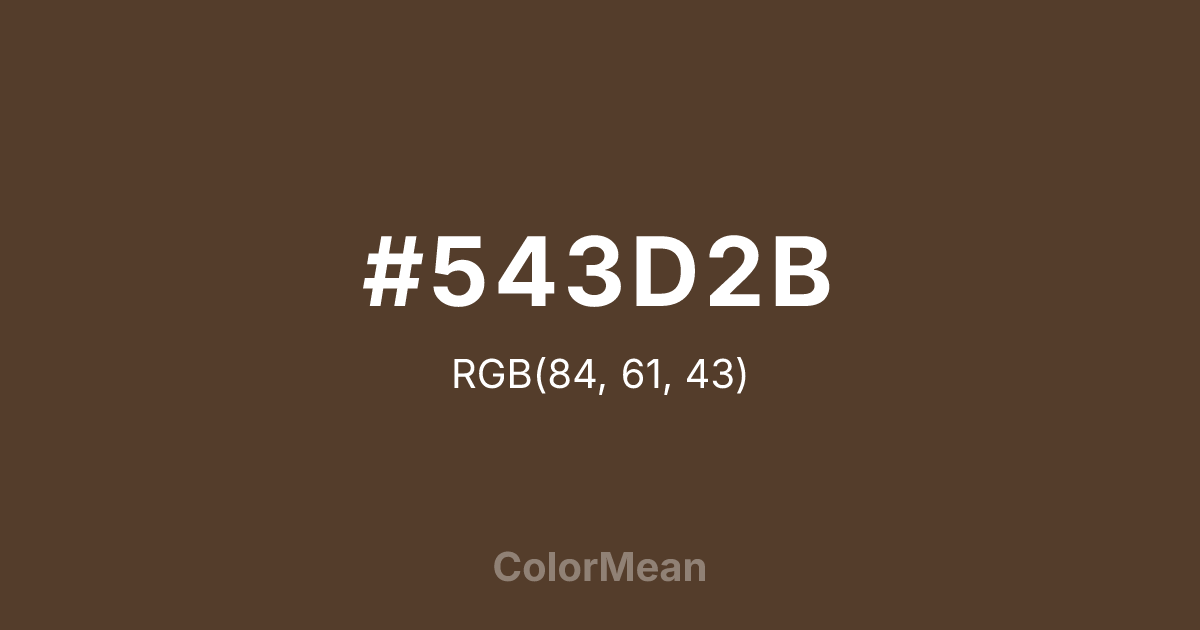 #543D2B RGB value is (84, 61, 43). The hex color red value is 84, green is 61, and blue is 43. Its HSL format shows a hue of 26°, saturation of 32 percent, and lightness of 25 percent. The CMYK process values are 0 percent, 27 percent, 49 percent, 67 percent.