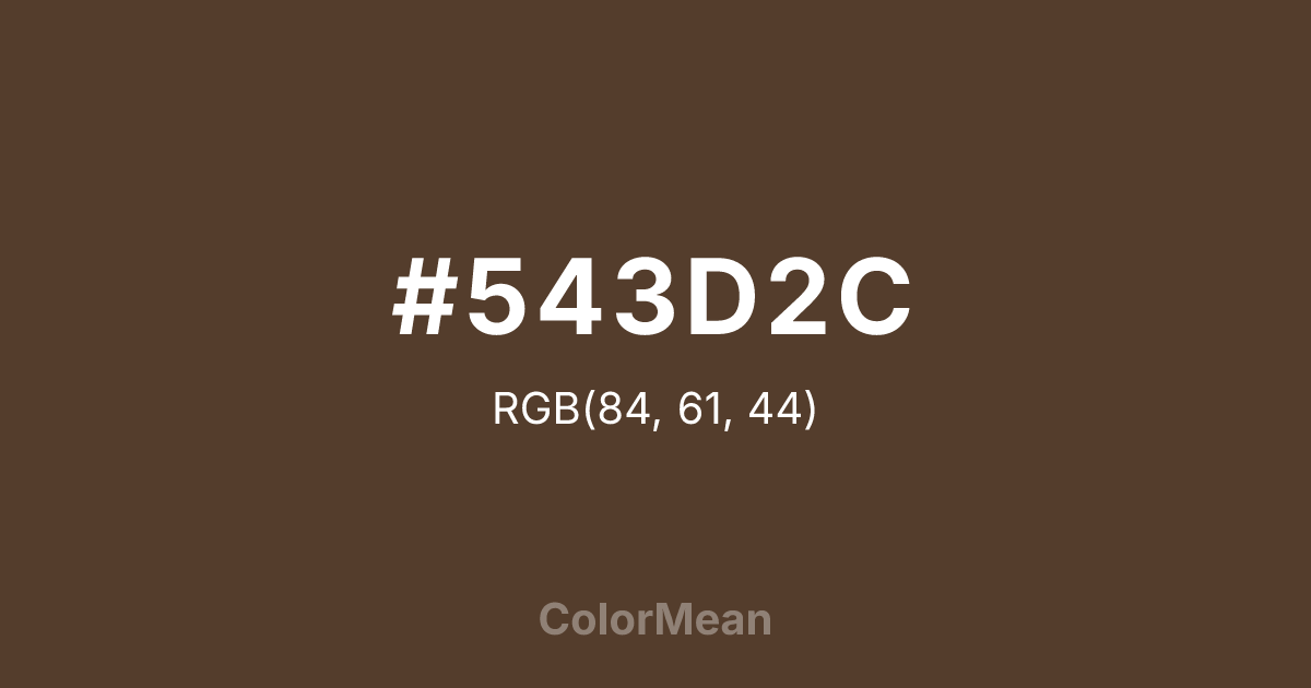 #543D2C RGB value is (84, 61, 44). The hex color red value is 84, green is 61, and blue is 44. Its HSL format shows a hue of 26°, saturation of 31 percent, and lightness of 25 percent. The CMYK process values are 0 percent, 27 percent, 48 percent, 67 percent.