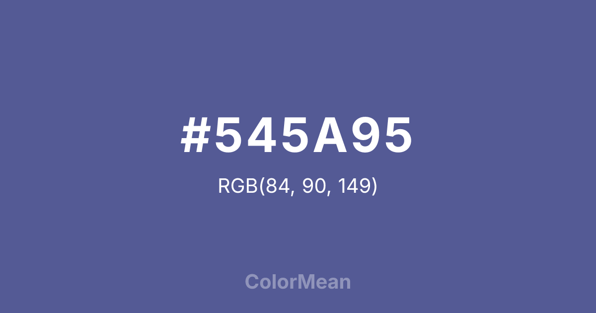 #545A95 RGB value is (84, 90, 149). The hex color red value is 84, green is 90, and blue is 149. Its HSL format shows a hue of 234°, saturation of 28 percent, and lightness of 46 percent. The CMYK process values are 44 percent, 40 percent, 0 percent, 42 percent.