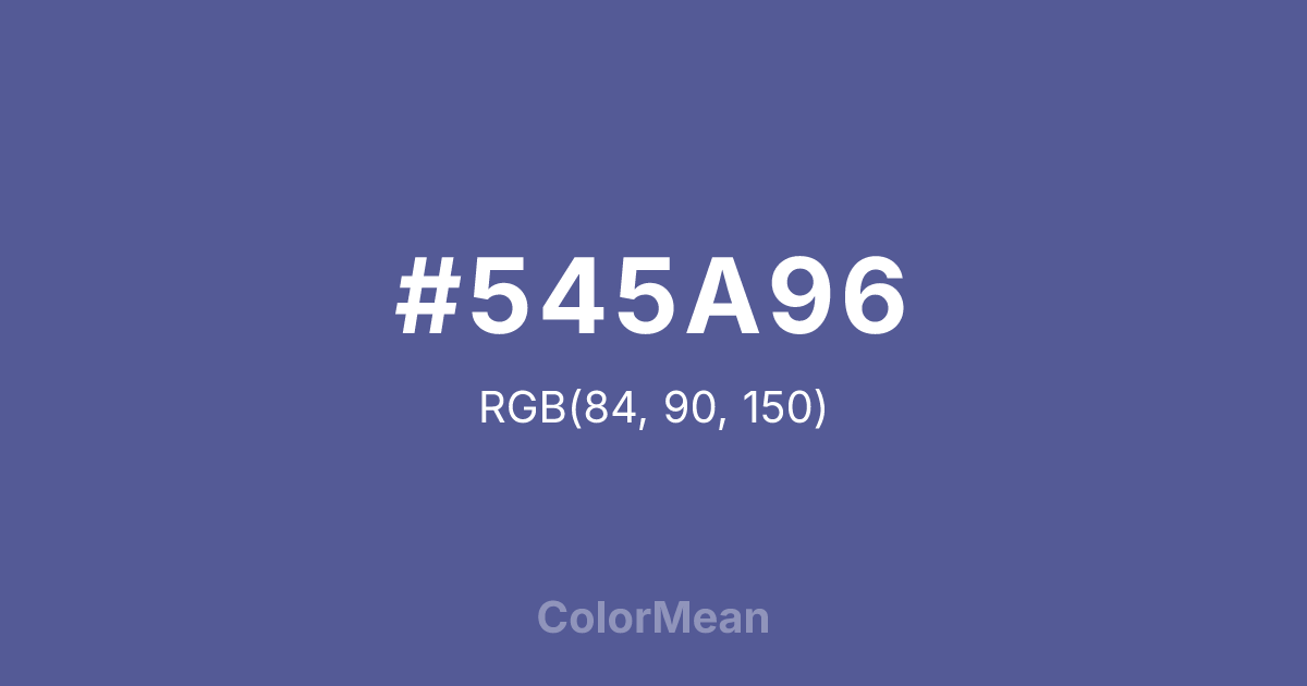 #545A96 RGB value is (84, 90, 150). The hex color red value is 84, green is 90, and blue is 150. Its HSL format shows a hue of 235°, saturation of 28 percent, and lightness of 46 percent. The CMYK process values are 44 percent, 40 percent, 0 percent, 41 percent.