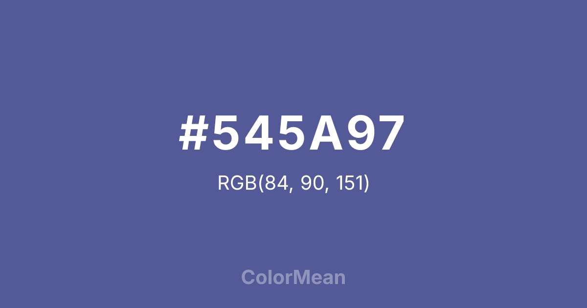 #545A97 RGB value is (84, 90, 151). The hex color red value is 84, green is 90, and blue is 151. Its HSL format shows a hue of 235°, saturation of 29 percent, and lightness of 46 percent. The CMYK process values are 44 percent, 40 percent, 0 percent, 41 percent.