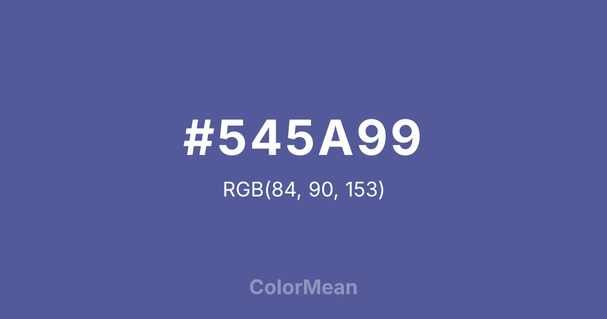 #545A99 RGB value is (84, 90, 153). The hex color red value is 84, green is 90, and blue is 153. Its HSL format shows a hue of 235°, saturation of 29 percent, and lightness of 46 percent. The CMYK process values are 45 percent, 41 percent, 0 percent, 40 percent.