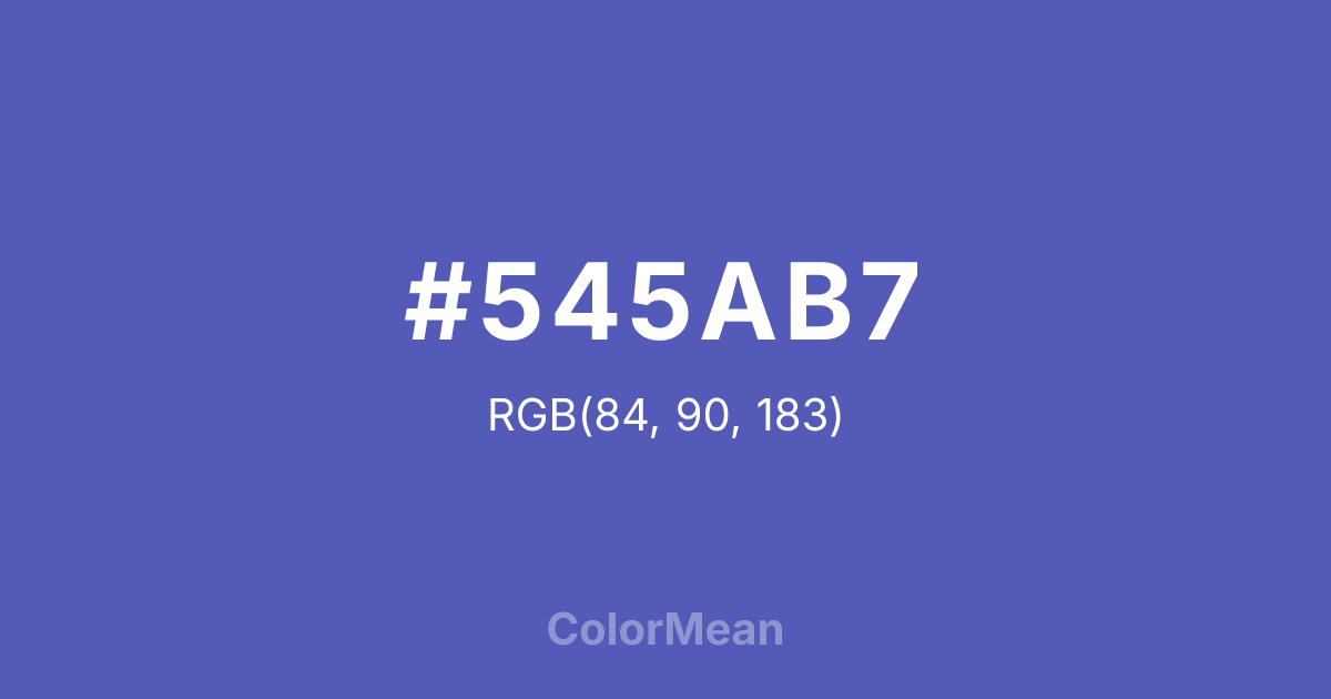 #545AB7 RGB value is (84, 90, 183). The hex color red value is 84, green is 90, and blue is 183. Its HSL format shows a hue of 236°, saturation of 41 percent, and lightness of 52 percent. The CMYK process values are 54 percent, 51 percent, 0 percent, 28 percent.