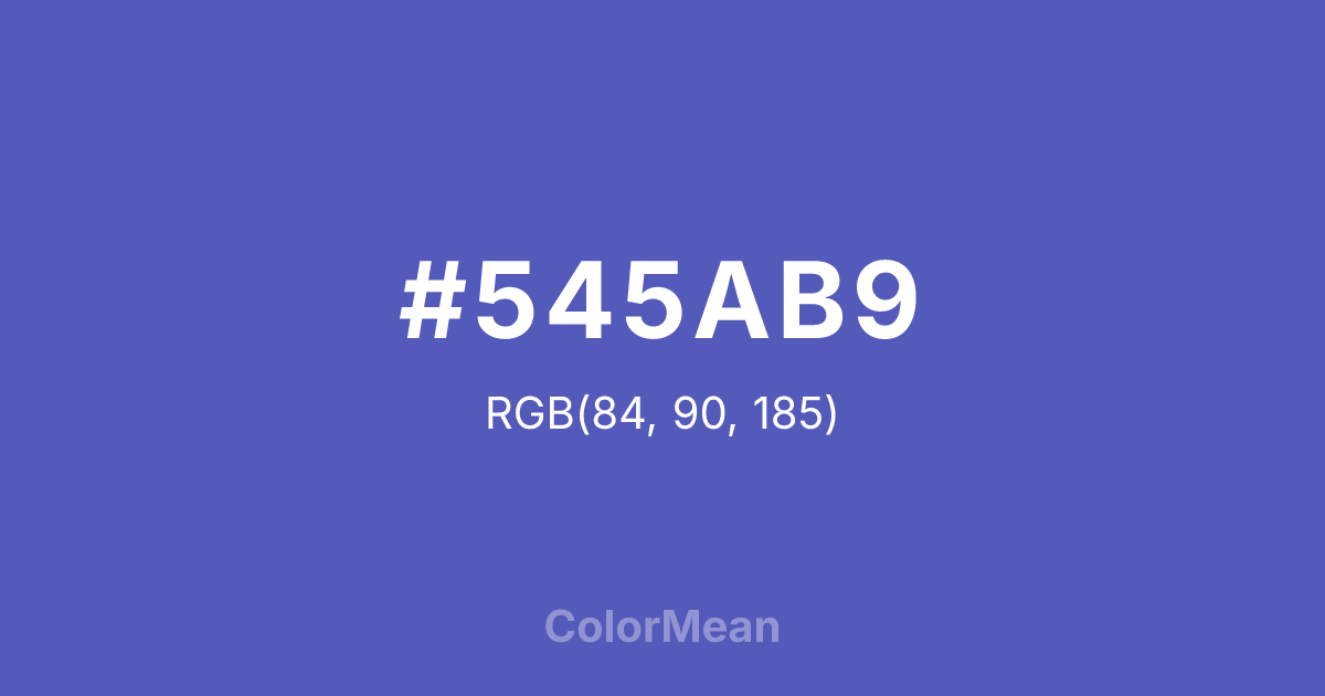 #545AB9 RGB value is (84, 90, 185). The hex color red value is 84, green is 90, and blue is 185. Its HSL format shows a hue of 236°, saturation of 42 percent, and lightness of 53 percent. The CMYK process values are 55 percent, 51 percent, 0 percent, 27 percent.