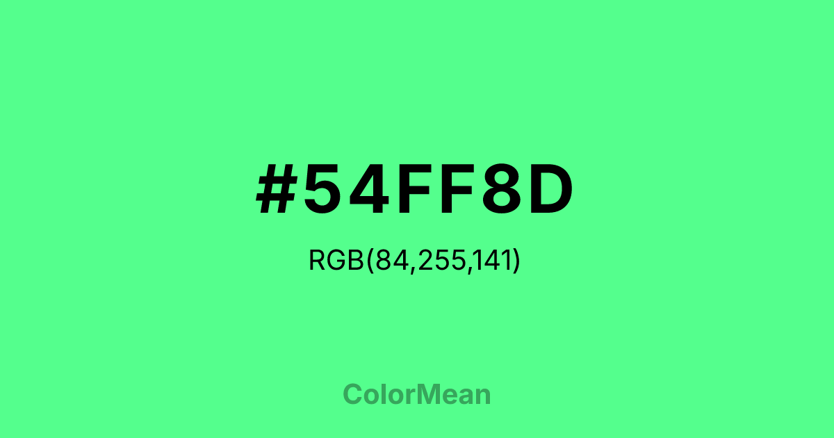 #54FF8D RGB value is (84, 255, 141). The hex color red value is 84, green is 255, and blue is 141. Its HSL format shows a hue of 140°, saturation of 100 percent, and lightness of 66 percent. The CMYK process values are 67 percent, 0 percent, 45 percent, 0 percent.
