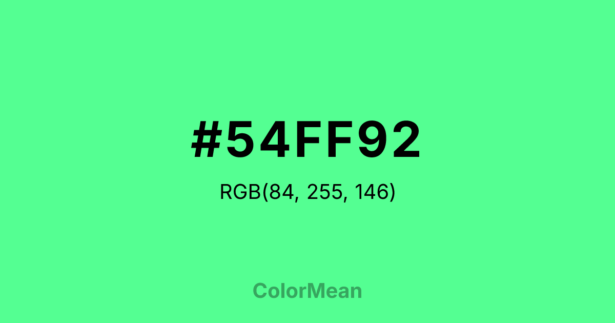 #54FF92 RGB value is (84, 255, 146). The hex color red value is 84, green is 255, and blue is 146. Its HSL format shows a hue of 142°, saturation of 100 percent, and lightness of 66 percent. The CMYK process values are 67 percent, 0 percent, 43 percent, 0 percent.