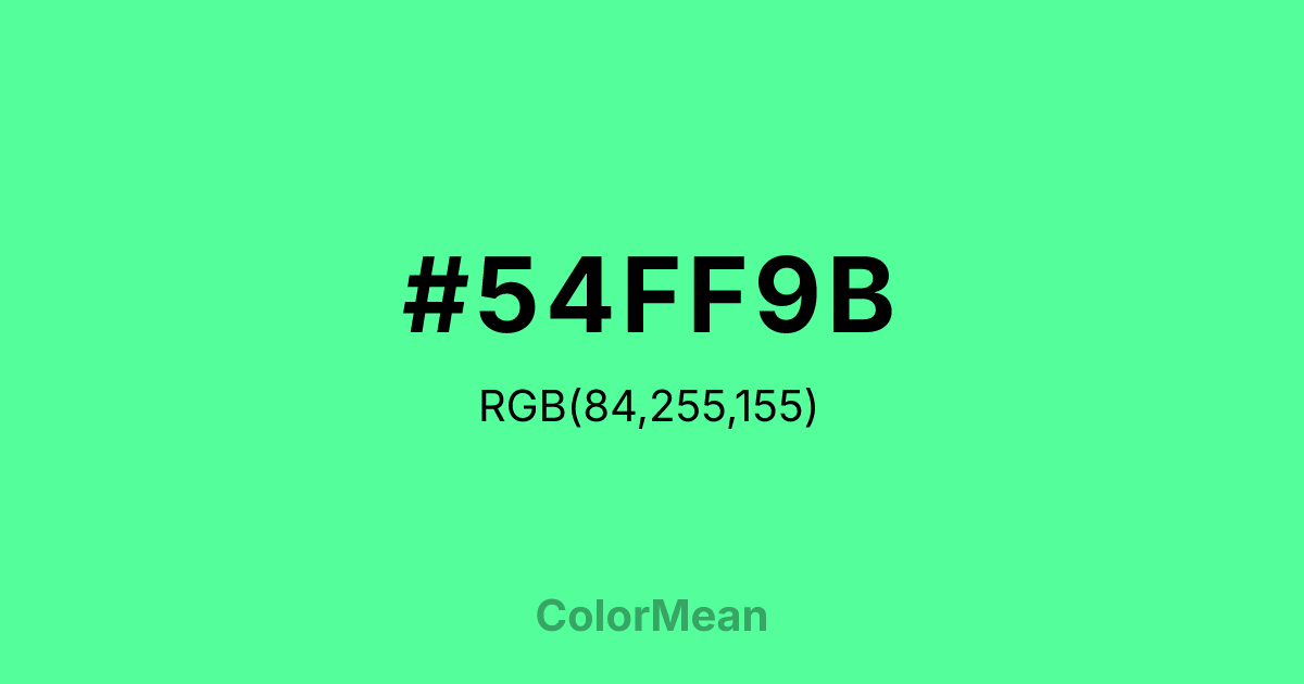 #54FF9B RGB value is (84, 255, 155). The hex color red value is 84, green is 255, and blue is 155. Its HSL format shows a hue of 145°, saturation of 100 percent, and lightness of 66 percent. The CMYK process values are 67 percent, 0 percent, 39 percent, 0 percent.