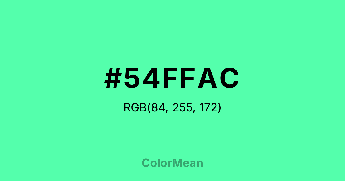 #54FFAC RGB value is (84, 255, 172). The hex color red value is 84, green is 255, and blue is 172. Its HSL format shows a hue of 151°, saturation of 100 percent, and lightness of 66 percent. The CMYK process values are 67 percent, 0 percent, 33 percent, 0 percent.