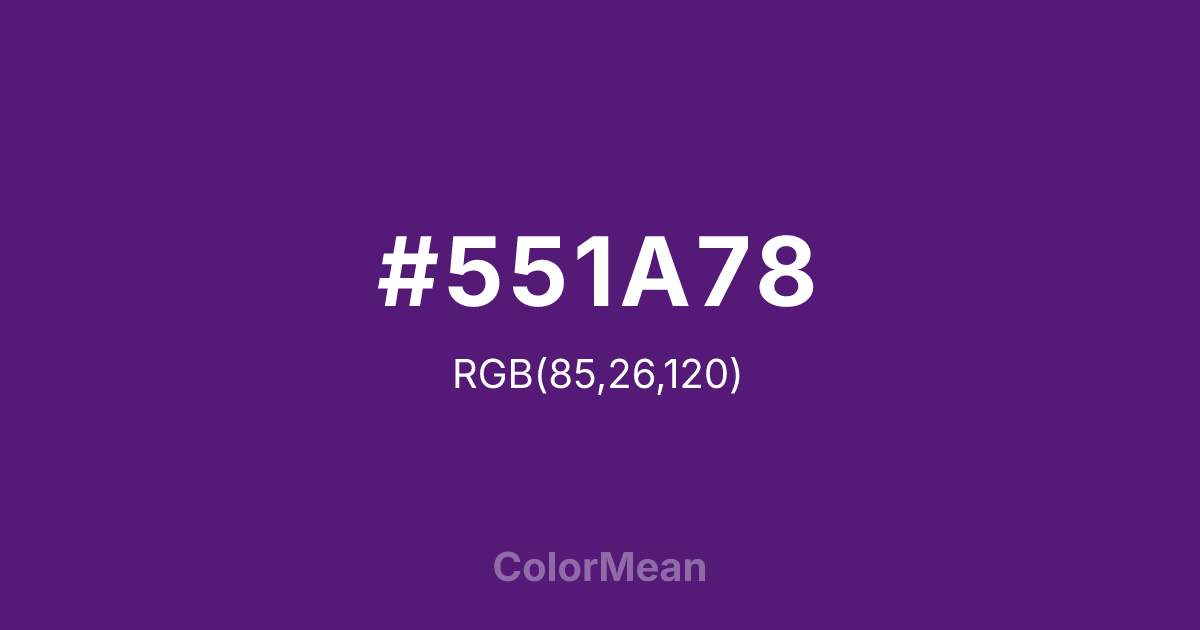 #551A78 RGB value is (85, 26, 120). The hex color red value is 85, green is 26, and blue is 120. Its HSL format shows a hue of 278°, saturation of 64 percent, and lightness of 29 percent. The CMYK process values are 29 percent, 78 percent, 0 percent, 53 percent.