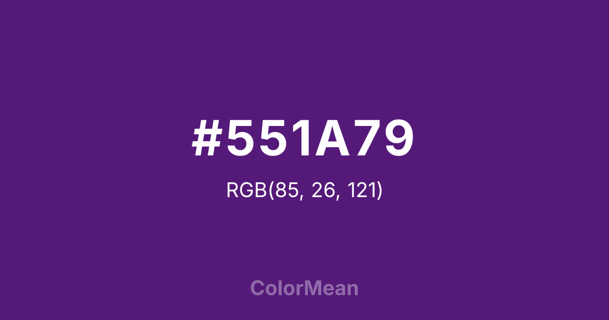 #551A79 RGB value is (85, 26, 121). The hex color red value is 85, green is 26, and blue is 121. Its HSL format shows a hue of 277°, saturation of 65 percent, and lightness of 29 percent. The CMYK process values are 30 percent, 79 percent, 0 percent, 53 percent.