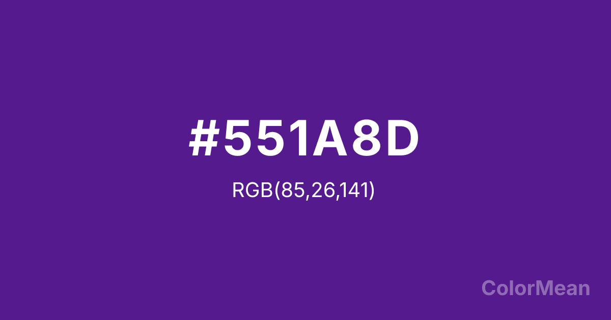 #551A8D RGB value is (85, 26, 141). The hex color red value is 85, green is 26, and blue is 141. Its HSL format shows a hue of 271°, saturation of 69 percent, and lightness of 33 percent. The CMYK process values are 40 percent, 82 percent, 0 percent, 45 percent.