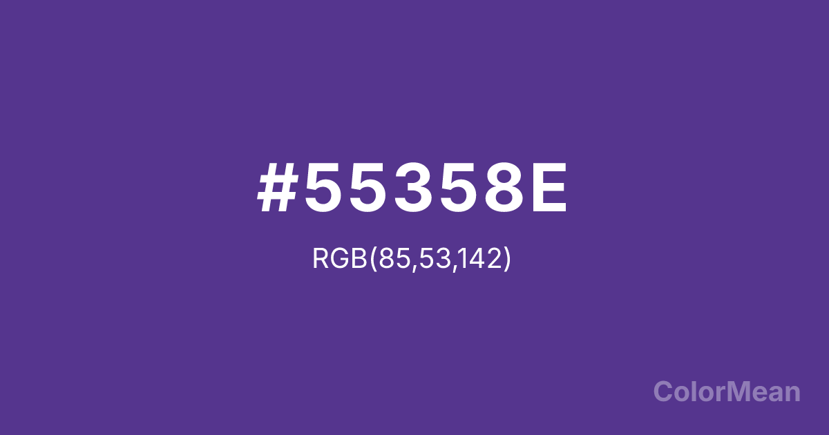 #55358E RGB value is (85, 53, 142). The hex color red value is 85, green is 53, and blue is 142. Its HSL format shows a hue of 262°, saturation of 46 percent, and lightness of 38 percent. The CMYK process values are 40 percent, 63 percent, 0 percent, 44 percent.