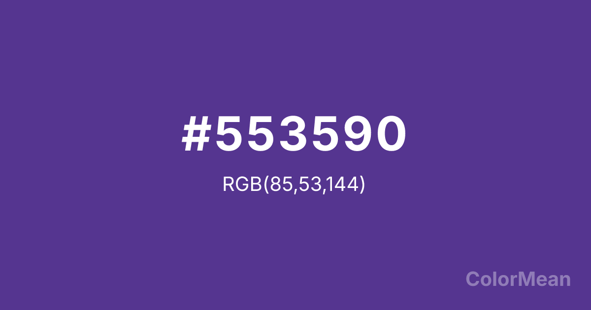 #553590 RGB value is (85, 53, 144). The hex color red value is 85, green is 53, and blue is 144. Its HSL format shows a hue of 261°, saturation of 46 percent, and lightness of 39 percent. The CMYK process values are 41 percent, 63 percent, 0 percent, 44 percent.