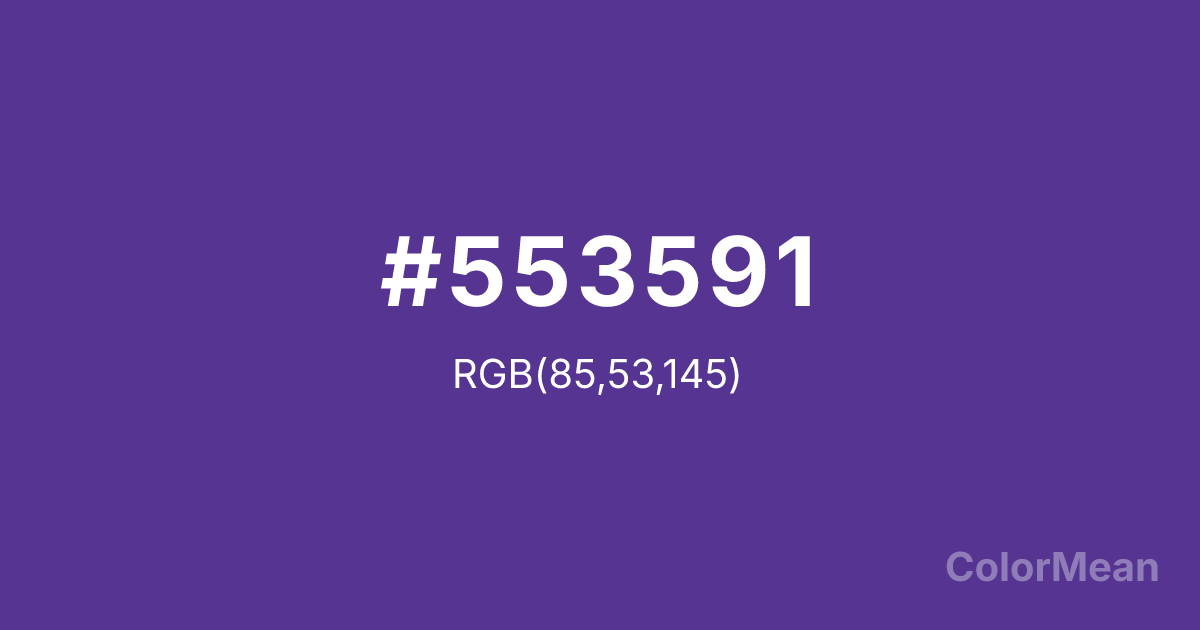 #553591 RGB value is (85, 53, 145). The hex color red value is 85, green is 53, and blue is 145. Its HSL format shows a hue of 261°, saturation of 46 percent, and lightness of 39 percent. The CMYK process values are 41 percent, 63 percent, 0 percent, 43 percent.