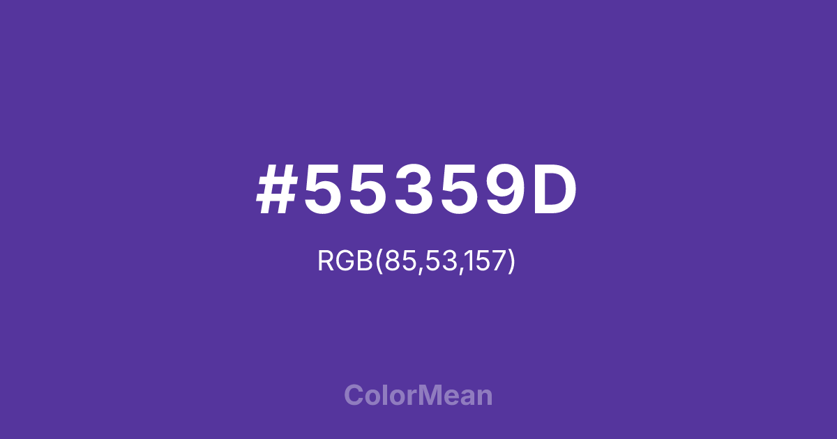 #55359D RGB value is (85, 53, 157). The hex color red value is 85, green is 53, and blue is 157. Its HSL format shows a hue of 258°, saturation of 50 percent, and lightness of 41 percent. The CMYK process values are 46 percent, 66 percent, 0 percent, 38 percent.