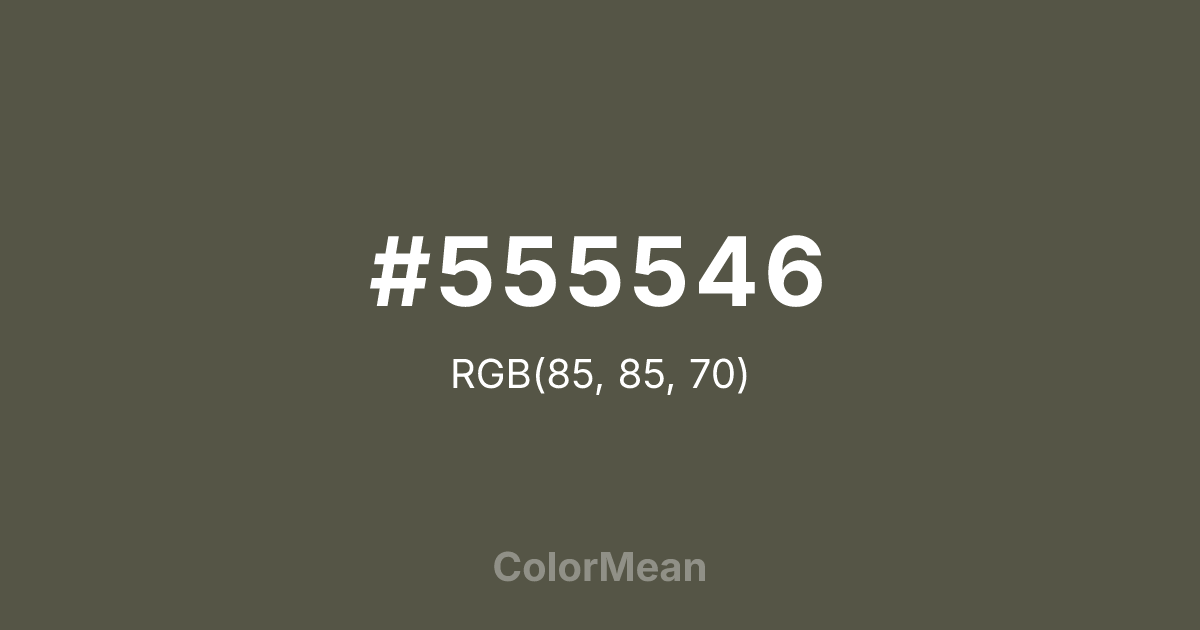#555546 RGB value is (85, 85, 70). The hex color red value is 85, green is 85, and blue is 70. Its HSL format shows a hue of 60°, saturation of 10 percent, and lightness of 30 percent. The CMYK process values are 0 percent, 0 percent, 18 percent, 67 percent.