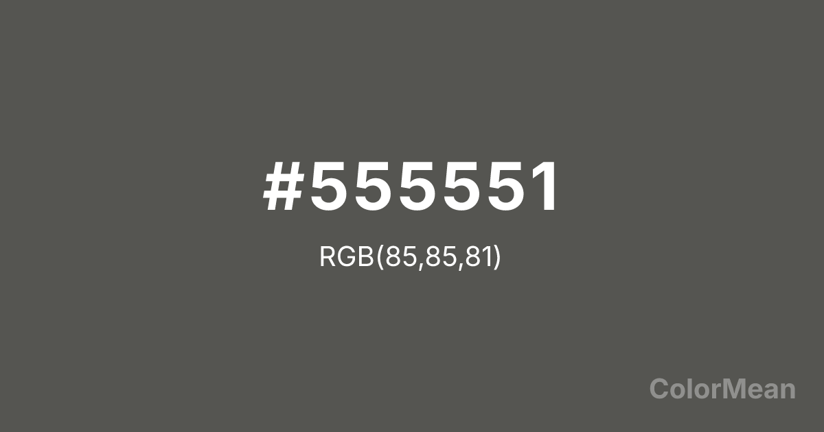 #555551 RGB value is (85, 85, 81). The hex color red value is 85, green is 85, and blue is 81. Its HSL format shows a hue of 60°, saturation of 2 percent, and lightness of 33 percent. The CMYK process values are 0 percent, 0 percent, 5 percent, 67 percent.