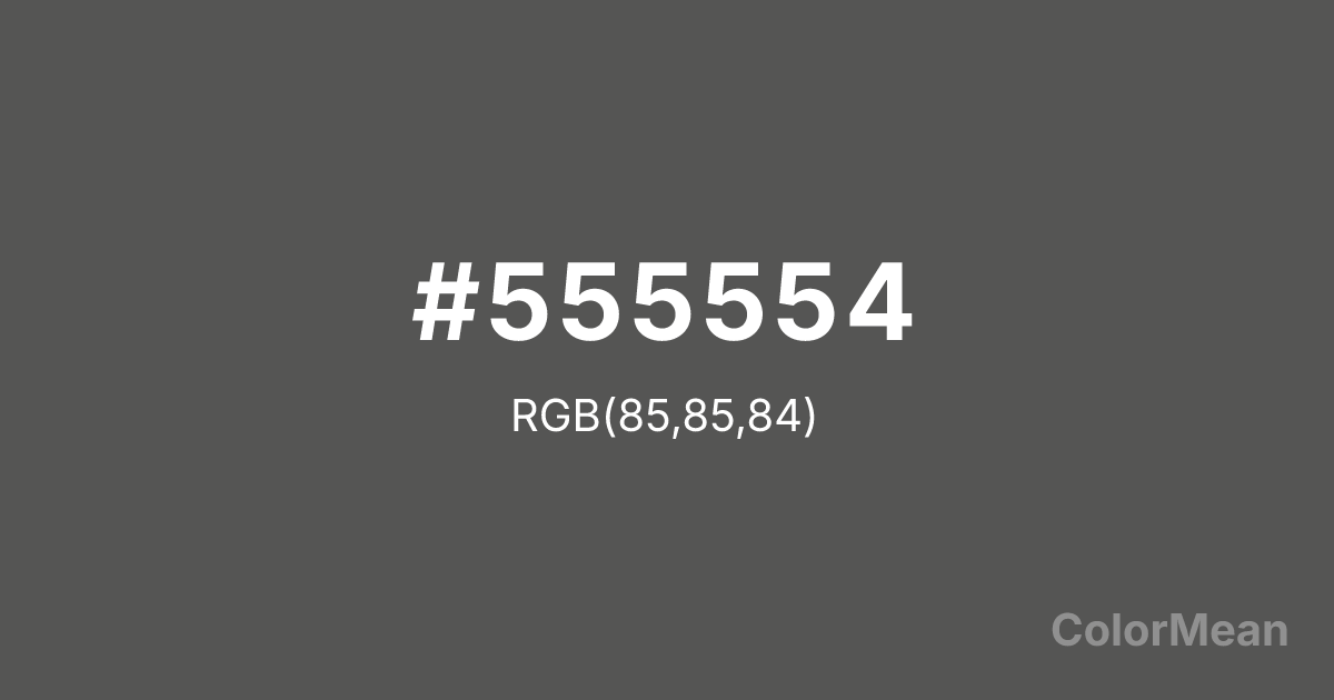 #555554 RGB value is (85, 85, 84). The hex color red value is 85, green is 85, and blue is 84. Its HSL format shows a hue of 60°, saturation of 1 percent, and lightness of 33 percent. The CMYK process values are 0 percent, 0 percent, 1 percent, 67 percent.