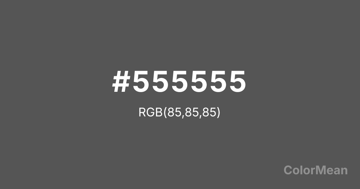 Davy Grey (#555555) RGB value is (85, 85, 85). The hex color red value is 85, green is 85, and blue is 85. Its HSL format shows a hue of 0°, saturation of 0 percent, and lightness of 33 percent. The CMYK process values are 0 percent, 0 percent, 0 percent, 67 percent.