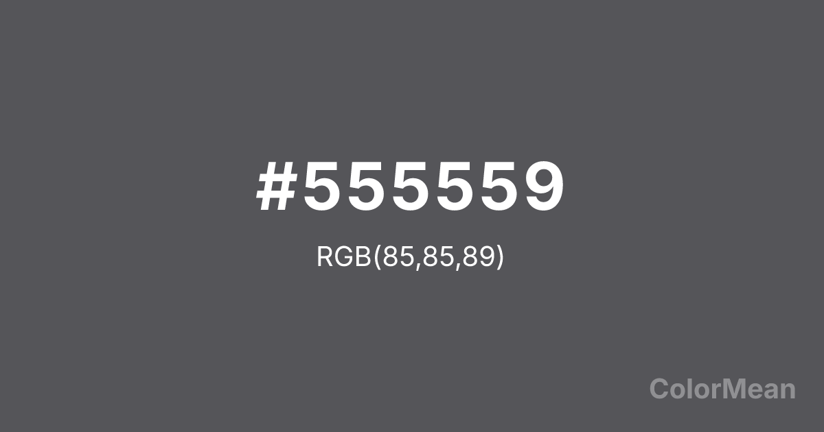 #555559 RGB value is (85, 85, 89). The hex color red value is 85, green is 85, and blue is 89. Its HSL format shows a hue of 240°, saturation of 2 percent, and lightness of 34 percent. The CMYK process values are 4 percent, 4 percent, 0 percent, 65 percent.