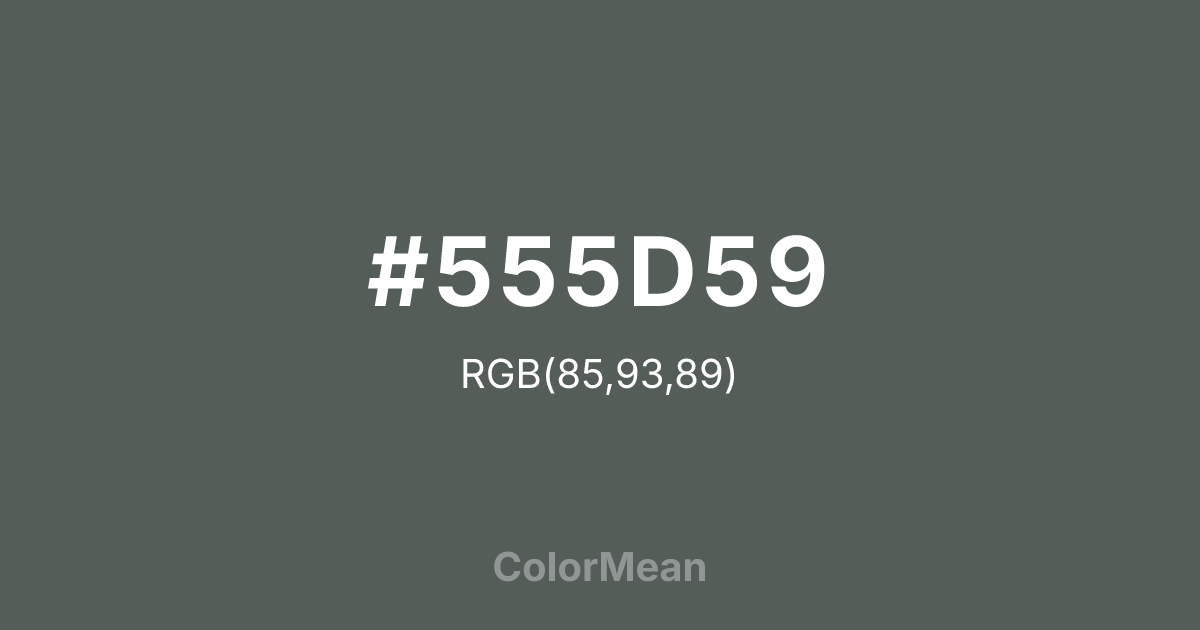 #555D59 RGB value is (85, 93, 89). The hex color red value is 85, green is 93, and blue is 89. Its HSL format shows a hue of 150°, saturation of 4 percent, and lightness of 35 percent. The CMYK process values are 9 percent, 0 percent, 4 percent, 64 percent.