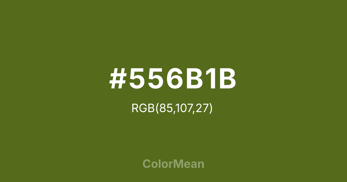 #556B1B RGB value is (85, 107, 27). The hex color red value is 85, green is 107, and blue is 27. Its HSL format shows a hue of 77°, saturation of 60 percent, and lightness of 26 percent. The CMYK process values are 21 percent, 0 percent, 75 percent, 58 percent.