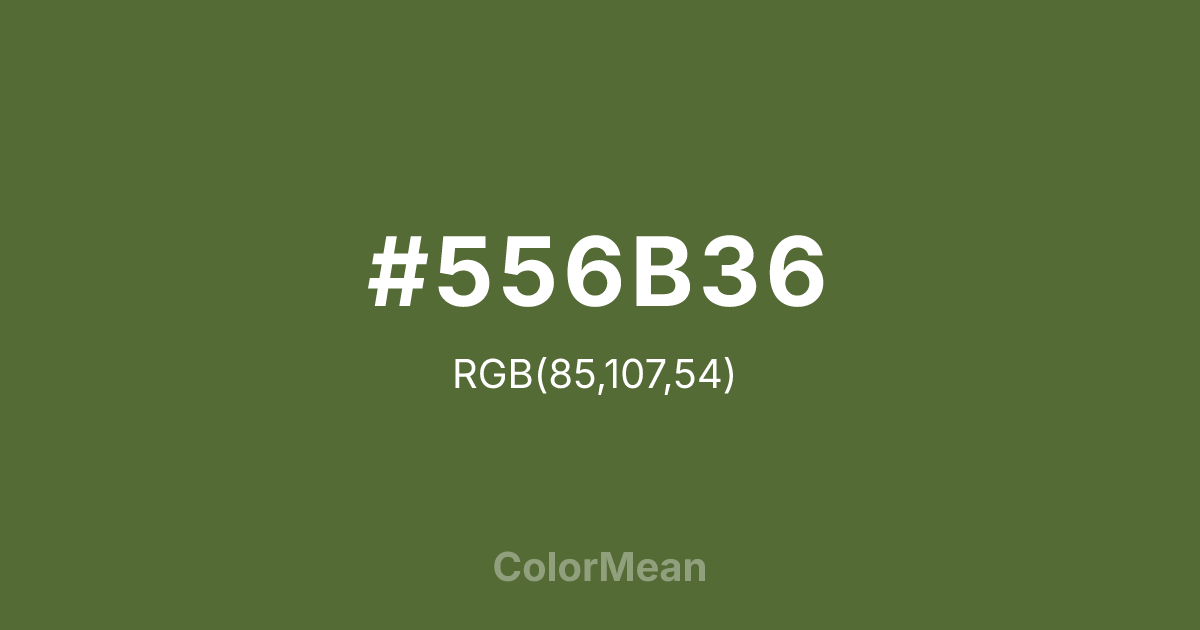 #556B36 RGB value is (85, 107, 54). The hex color red value is 85, green is 107, and blue is 54. Its HSL format shows a hue of 85°, saturation of 33 percent, and lightness of 32 percent. The CMYK process values are 21 percent, 0 percent, 50 percent, 58 percent.