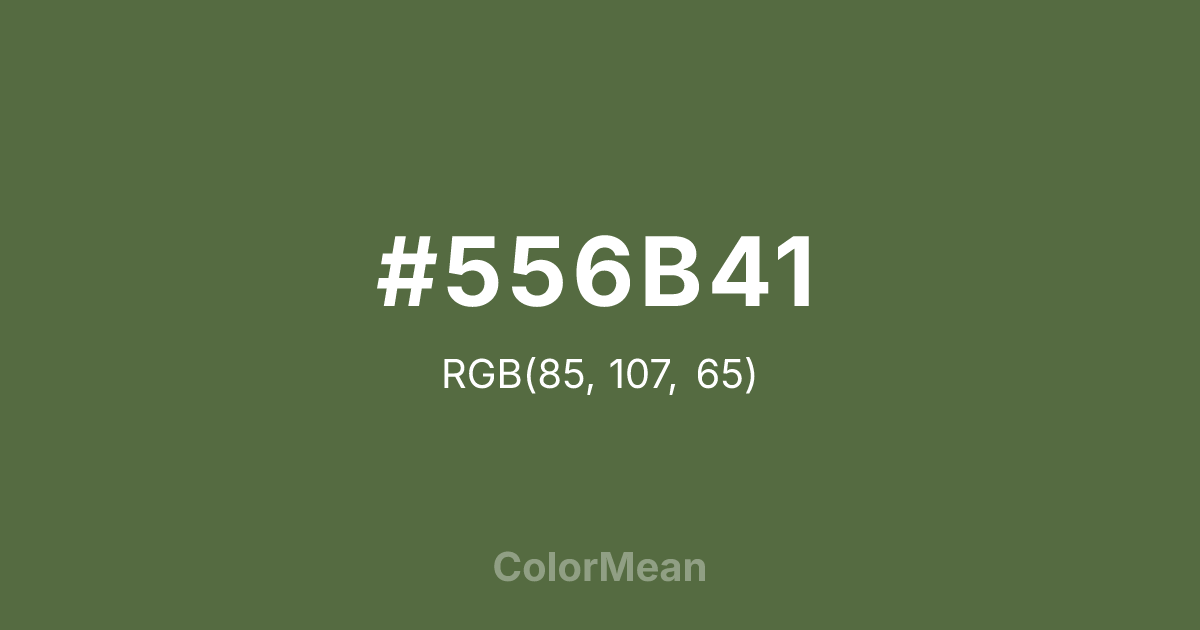 #556B41 RGB value is (85, 107, 65). The hex color red value is 85, green is 107, and blue is 65. Its HSL format shows a hue of 91°, saturation of 24 percent, and lightness of 34 percent. The CMYK process values are 21 percent, 0 percent, 39 percent, 58 percent.