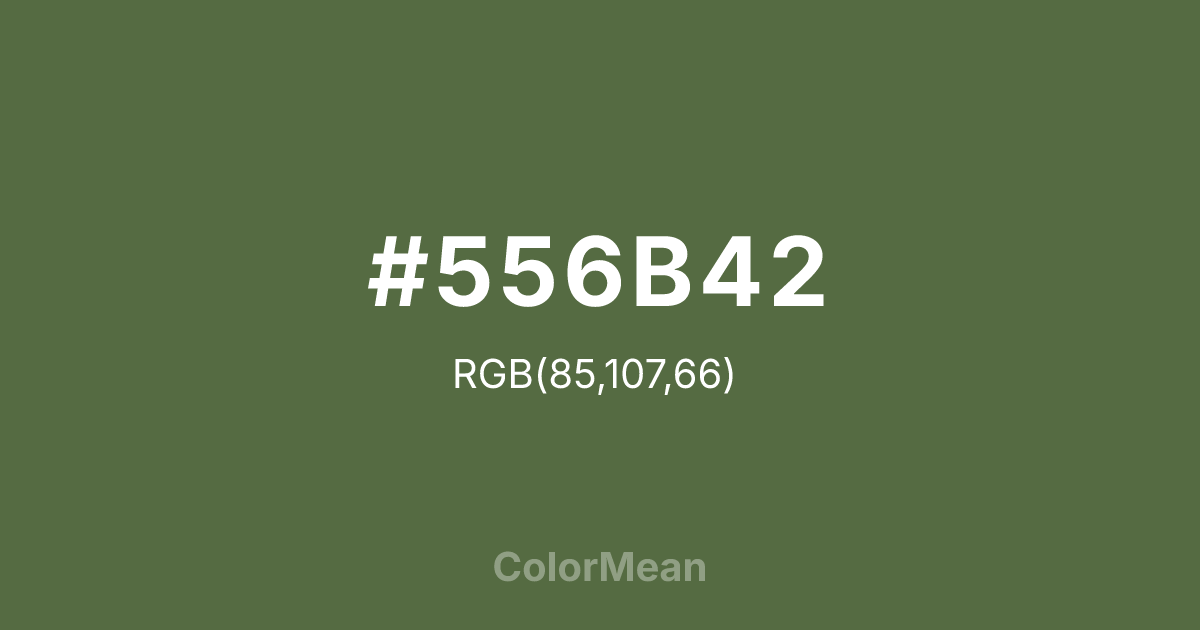 #556B42 RGB value is (85, 107, 66). The hex color red value is 85, green is 107, and blue is 66. Its HSL format shows a hue of 92°, saturation of 24 percent, and lightness of 34 percent. The CMYK process values are 21 percent, 0 percent, 38 percent, 58 percent.