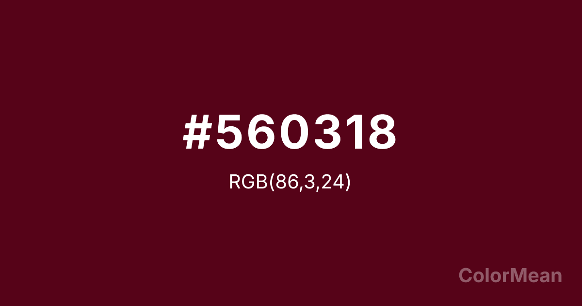 #560318 RGB value is (86, 3, 24). The hex color red value is 86, green is 3, and blue is 24. Its HSL format shows a hue of 345°, saturation of 93 percent, and lightness of 17 percent. The CMYK process values are 0 percent, 97 percent, 72 percent, 66 percent.