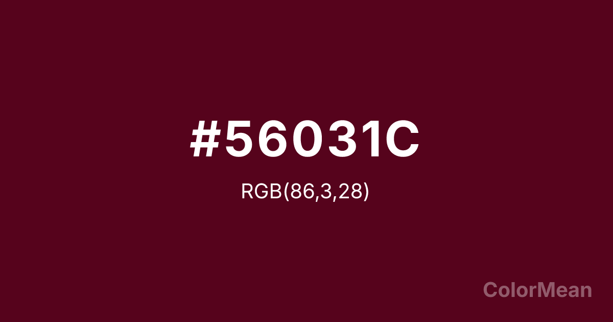 #56031C RGB value is (86, 3, 28). The hex color red value is 86, green is 3, and blue is 28. Its HSL format shows a hue of 342°, saturation of 93 percent, and lightness of 17 percent. The CMYK process values are 0 percent, 97 percent, 67 percent, 66 percent.