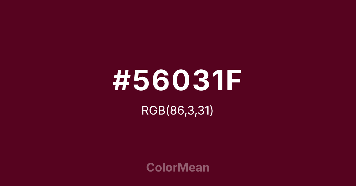 #56031F RGB value is (86, 3, 31). The hex color red value is 86, green is 3, and blue is 31. Its HSL format shows a hue of 340°, saturation of 93 percent, and lightness of 17 percent. The CMYK process values are 0 percent, 97 percent, 64 percent, 66 percent.