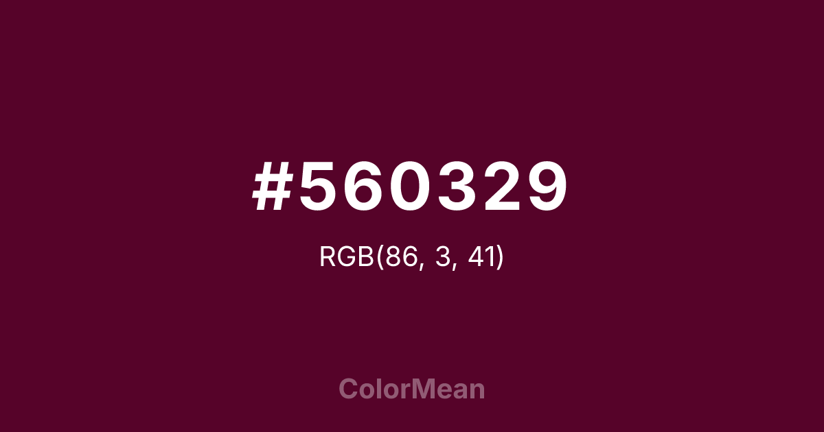 #560329 RGB value is (86, 3, 41). The hex color red value is 86, green is 3, and blue is 41. Its HSL format shows a hue of 333°, saturation of 93 percent, and lightness of 17 percent. The CMYK process values are 0 percent, 97 percent, 52 percent, 66 percent.