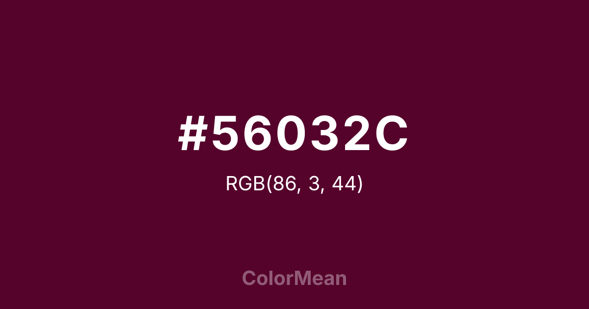 #56032C RGB value is (86, 3, 44). The hex color red value is 86, green is 3, and blue is 44. Its HSL format shows a hue of 330°, saturation of 93 percent, and lightness of 17 percent. The CMYK process values are 0 percent, 97 percent, 49 percent, 66 percent.