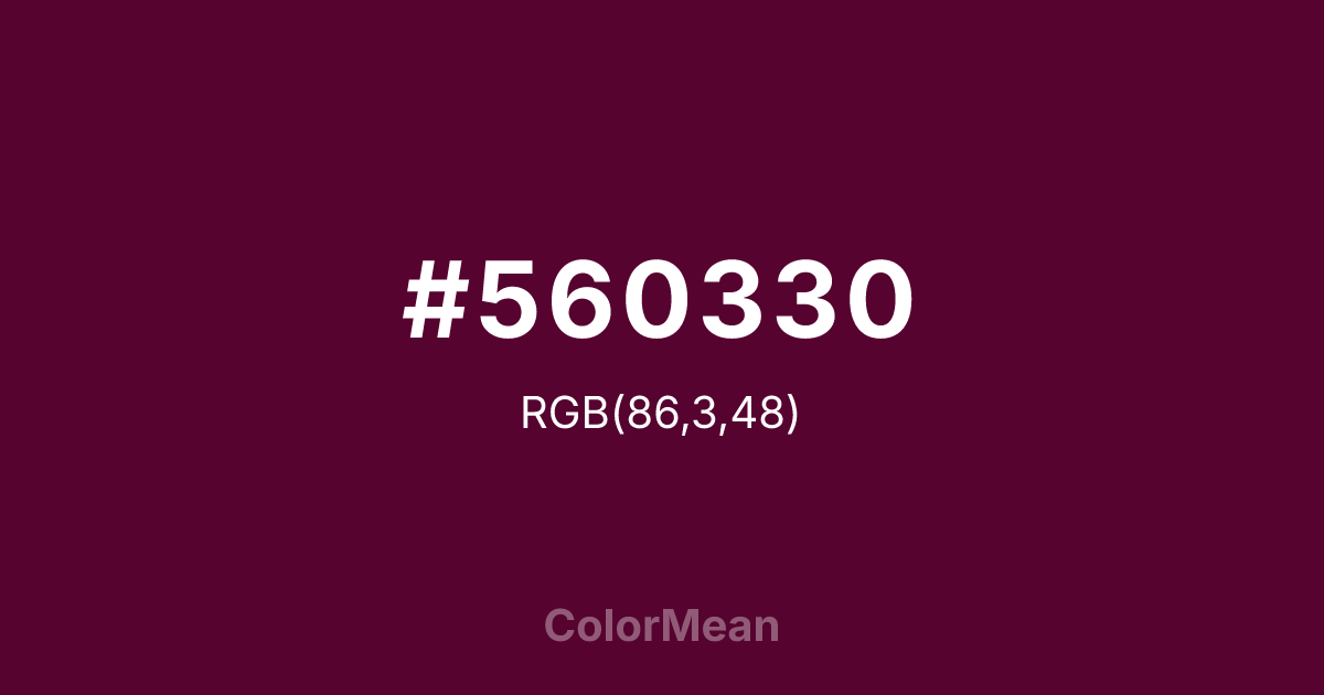 #560330 RGB value is (86, 3, 48). The hex color red value is 86, green is 3, and blue is 48. Its HSL format shows a hue of 327°, saturation of 93 percent, and lightness of 17 percent. The CMYK process values are 0 percent, 97 percent, 44 percent, 66 percent.