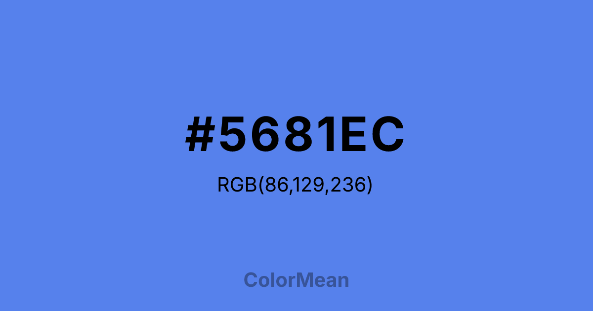 #5681EC RGB value is (86, 129, 236). The hex color red value is 86, green is 129, and blue is 236. Its HSL format shows a hue of 223°, saturation of 80 percent, and lightness of 63 percent. The CMYK process values are 64 percent, 45 percent, 0 percent, 7 percent.
