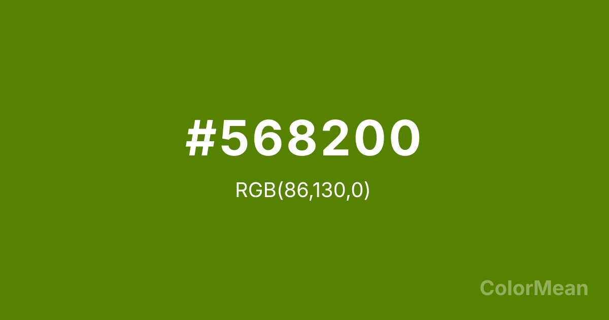 #568200 RGB value is (86, 130, 0). The hex color red value is 86, green is 130, and blue is 0. Its HSL format shows a hue of 80°, saturation of 100 percent, and lightness of 25 percent. The CMYK process values are 34 percent, 0 percent, 100 percent, 49 percent.