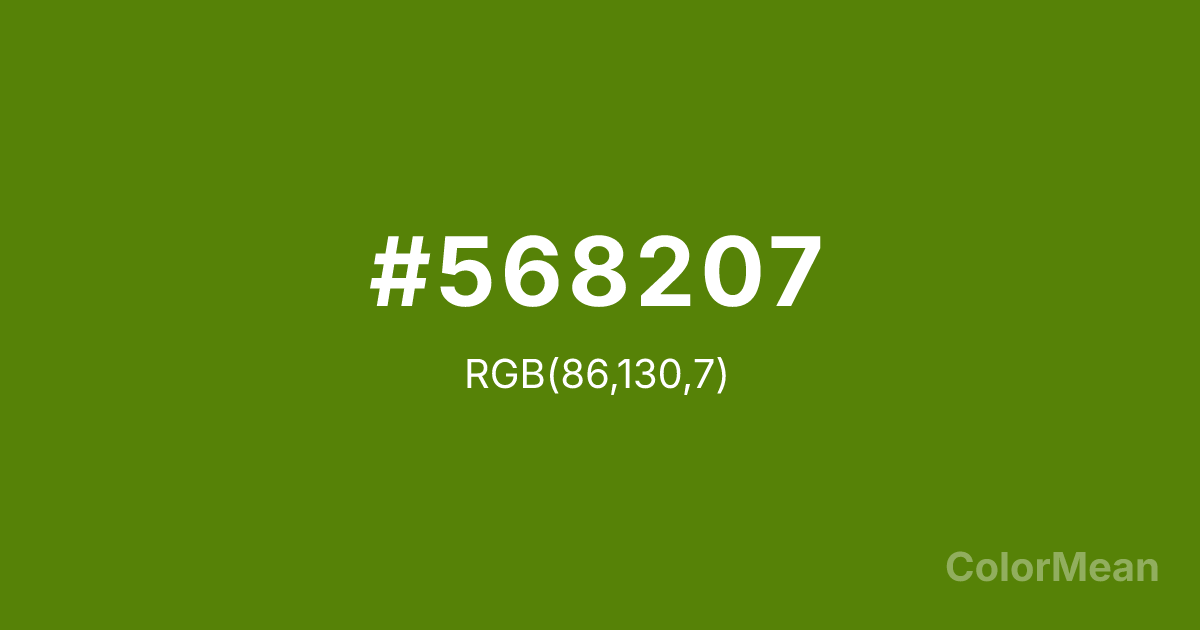 #568207 RGB value is (86, 130, 7). The hex color red value is 86, green is 130, and blue is 7. Its HSL format shows a hue of 81°, saturation of 90 percent, and lightness of 27 percent. The CMYK process values are 34 percent, 0 percent, 95 percent, 49 percent.