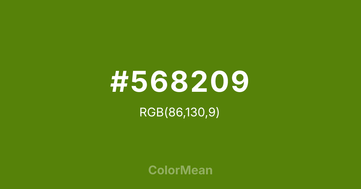 #568209 RGB value is (86, 130, 9). The hex color red value is 86, green is 130, and blue is 9. Its HSL format shows a hue of 82°, saturation of 87 percent, and lightness of 27 percent. The CMYK process values are 34 percent, 0 percent, 93 percent, 49 percent.