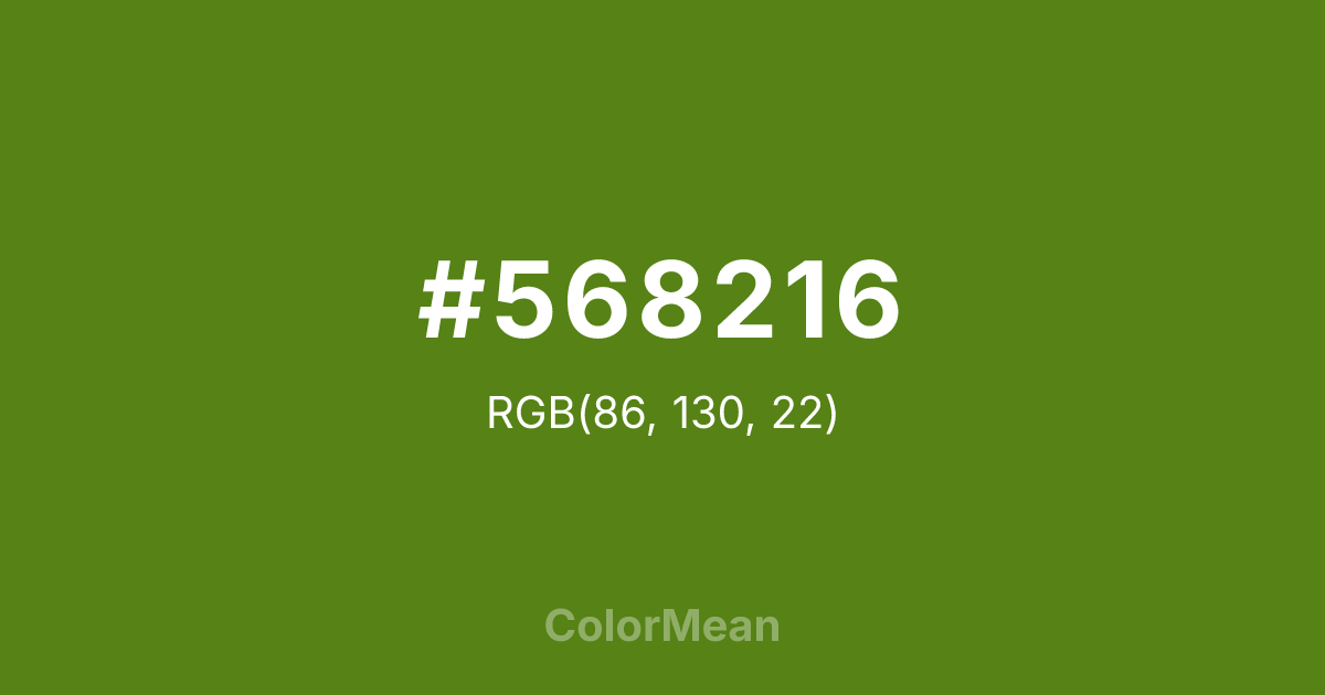 #568216 RGB value is (86, 130, 22). The hex color red value is 86, green is 130, and blue is 22. Its HSL format shows a hue of 84°, saturation of 71 percent, and lightness of 30 percent. The CMYK process values are 34 percent, 0 percent, 83 percent, 49 percent.