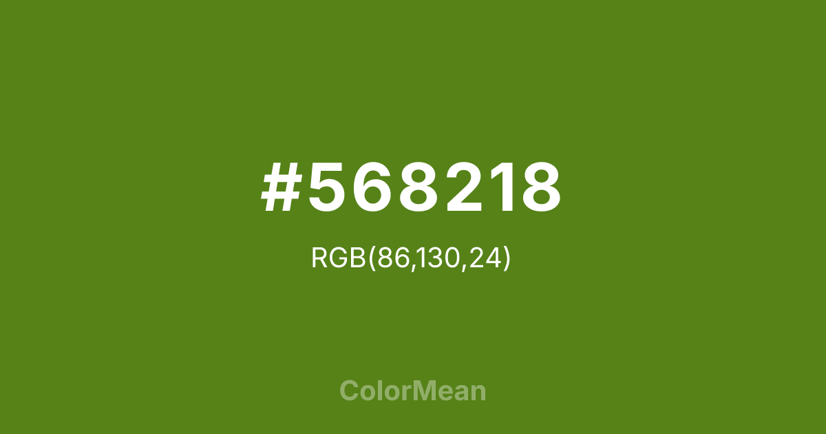 #568218 RGB value is (86, 130, 24). The hex color red value is 86, green is 130, and blue is 24. Its HSL format shows a hue of 85°, saturation of 69 percent, and lightness of 30 percent. The CMYK process values are 34 percent, 0 percent, 82 percent, 49 percent.