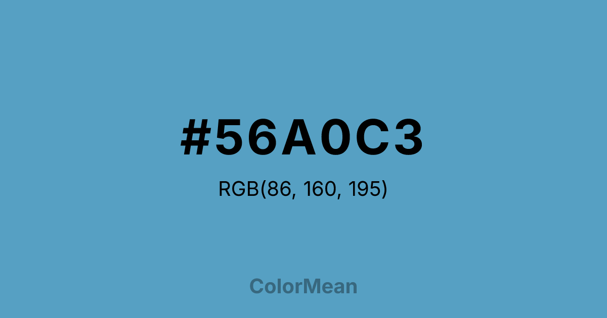 #56A0C3 RGB value is (86, 160, 195). The hex color red value is 86, green is 160, and blue is 195. Its HSL format shows a hue of 199°, saturation of 48 percent, and lightness of 55 percent. The CMYK process values are 56 percent, 18 percent, 0 percent, 24 percent.