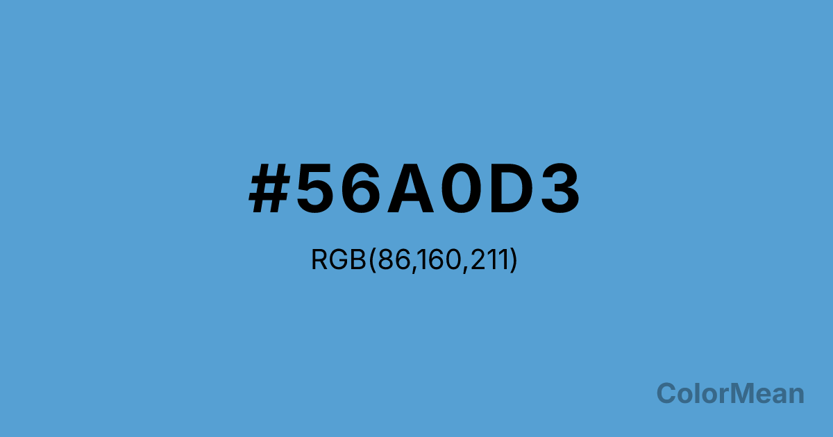 Carolina Blue (#56A0D3) RGB value is (86, 160, 211). The hex color red value is 86, green is 160, and blue is 211. Its HSL format shows a hue of 204°, saturation of 59 percent, and lightness of 58 percent. The CMYK process values are 59 percent, 24 percent, 0 percent, 17 percent.