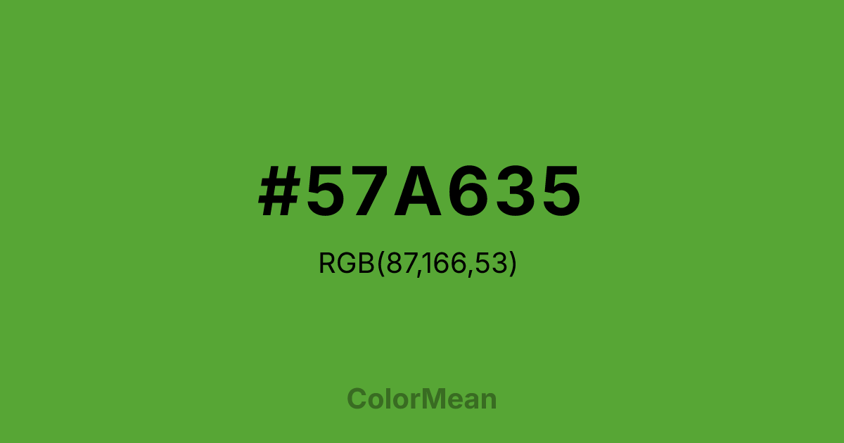 #57A635 RGB value is (87, 166, 53). The hex color red value is 87, green is 166, and blue is 53. Its HSL format shows a hue of 102°, saturation of 52 percent, and lightness of 43 percent. The CMYK process values are 48 percent, 0 percent, 68 percent, 35 percent.