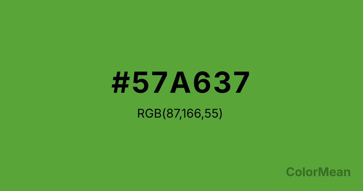 #57A637 RGB value is (87, 166, 55). The hex color red value is 87, green is 166, and blue is 55. Its HSL format shows a hue of 103°, saturation of 50 percent, and lightness of 43 percent. The CMYK process values are 48 percent, 0 percent, 67 percent, 35 percent.