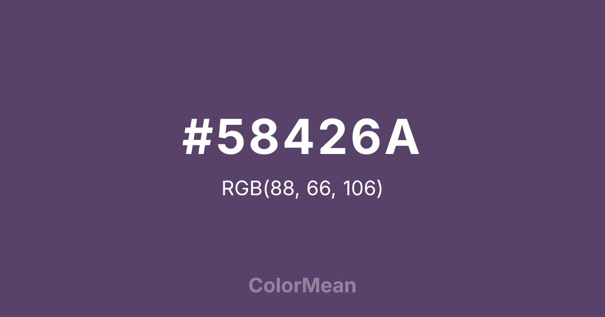 #58426A RGB value is (88, 66, 106). The hex color red value is 88, green is 66, and blue is 106. Its HSL format shows a hue of 273°, saturation of 23 percent, and lightness of 34 percent. The CMYK process values are 17 percent, 38 percent, 0 percent, 58 percent.