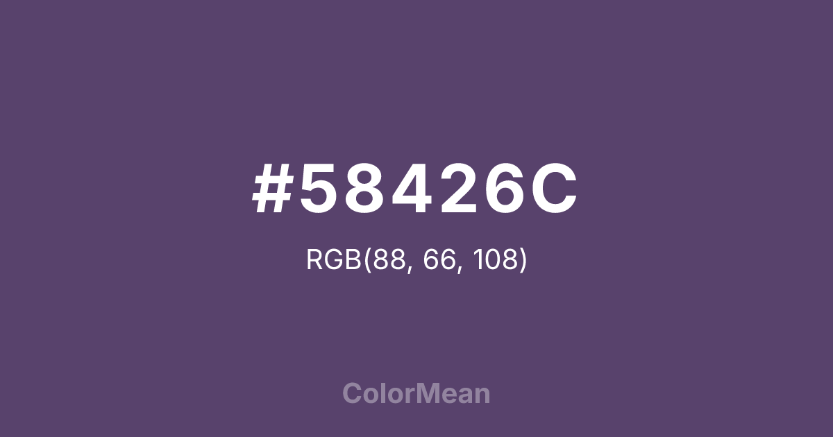 #58426C RGB value is (88, 66, 108). The hex color red value is 88, green is 66, and blue is 108. Its HSL format shows a hue of 271°, saturation of 24 percent, and lightness of 34 percent. The CMYK process values are 19 percent, 39 percent, 0 percent, 58 percent.